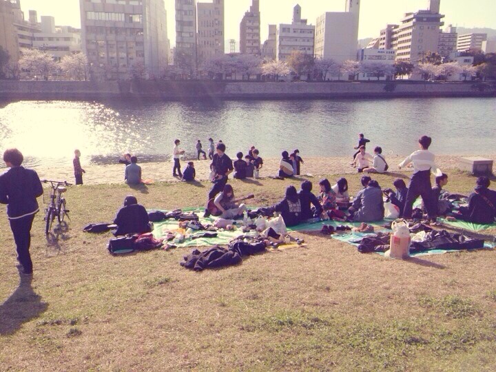 河川敷で遊んだり楽器をしたりお菓子を食べたり
